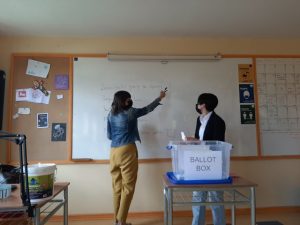 Finalmente, al término de todas las presentaciones, las y los estudiantes votaron por el grupo que más los representaba. Ambos cursos simularon una votación real, utilizando una urna, cámara secreta, votos, acta y roles ya designados para constituir la mesa de votación.