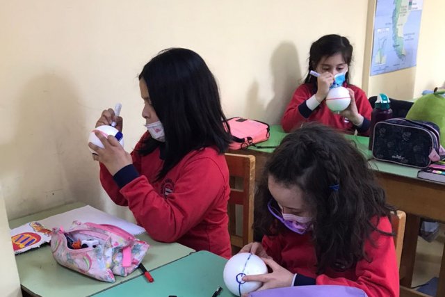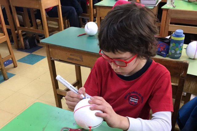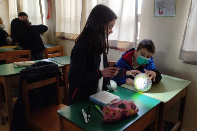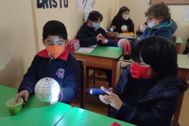 En una primera clase representaron las líneas de referencia: paralelos y meridianos en la pelota de plumavit y luego, en la clase siguiente, trabajaron zonas climáticas, donde observaron con la linterna la forma en que llega la luz a las diferentes partes de la Tierra.