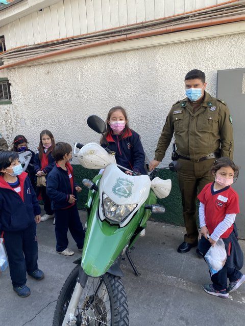 La actividad se inició con una visita a la comisaría, en donde un grupo de carabineros les mostraron sus dependencias e hicieron talleres para las/os estudiantes. Incluso pudieron subir a las motos.