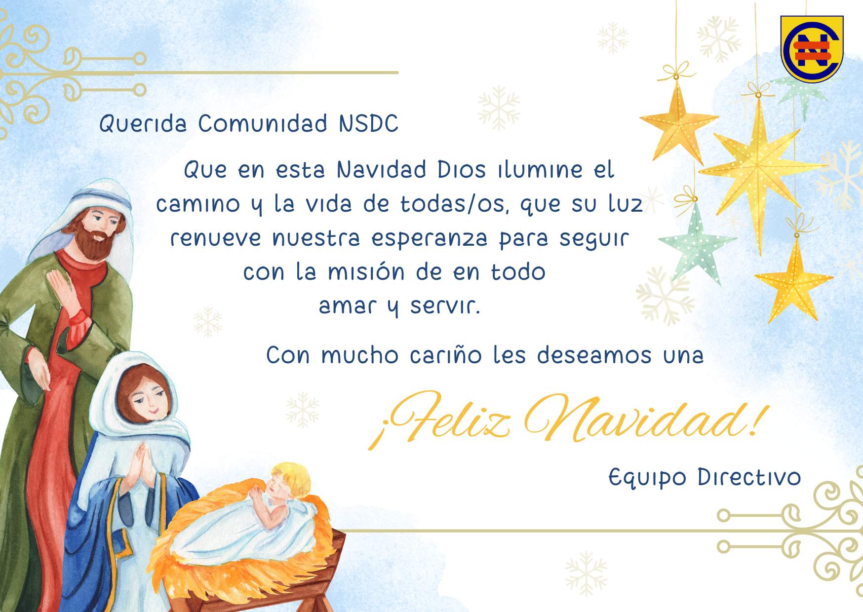 Comunicaciones, Comunidad NSDC, Navidad, Noticias Saludo de Navidad 23 de diciembre de 2022 Publicado por María Jesús Luco Lizama 23 Dic Querida Comunidad NSDC: Que en esta Navidad Dios ilumine el camino y la vida de todas/os, que su luz renueve nuestra esperanza para seguir con la misión de en todo amar y servir. Con mucho cariño les deseamos una ¡Feliz Navidad! Equipo Directivo